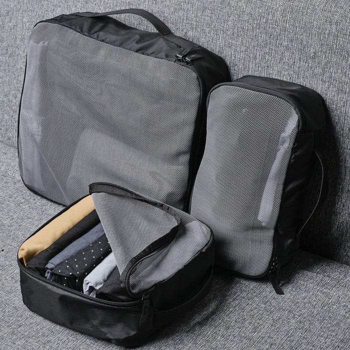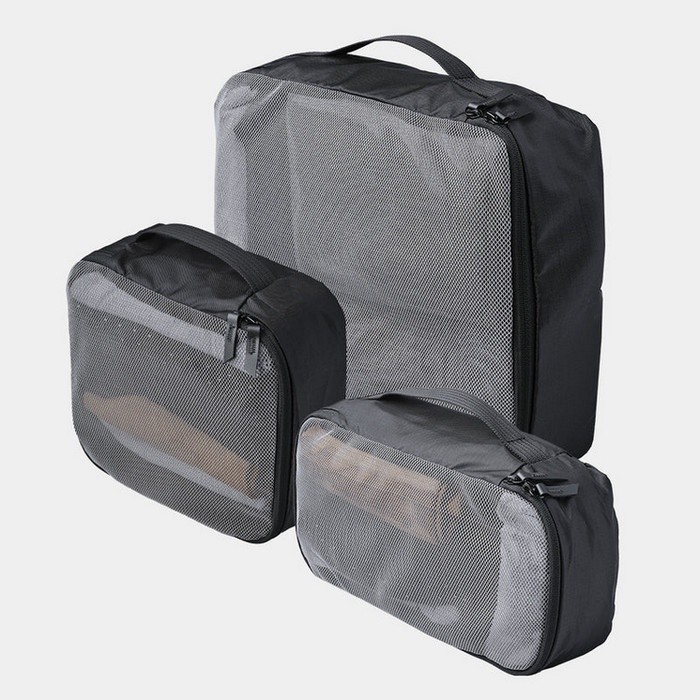 Space-Saving. Effortlessly organize your essentials with our space-saving Packing Cubes. The weatherproof fabric and mesh cover keeps your clothes, shoes, and gear protected and visible, while the foldable design guarantees they fit neatly into any travel bag. This set of three - small, medium, and large cubes - you won’t nt to travel without them. • Fabric: 210D Ripstop Nylon in Black or Green • Lightweight material with a mesh cover • Integrated hand-carry handle on each cube • Silent zippers • Wide zip opening • Foldable, durable & lightweight • 3 sizes for all your packing needs DIMENSIONS: Small Length: 31cm (12.20") x Height: 16.5cm (6.49") x Depth: 10cm (3.93") Volume: 5L Weight: 0.076KG Medium Length: 24cm (9.44") x Height: 22cm (8.66") x Depth: 11cm (4.33") Volume: 5.8L Weight: 0.077KG Large Length: 36cm (14.17") x Height: 32cm (12.59") x Depth: 10cm (3.93") Volume: 11.5L Weight: 0.12K