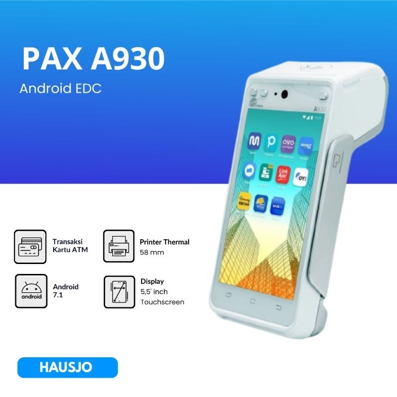 PAX A930 di lengkapi dengan • Mencetak kertas struk thermal 58mm • WIFI, Bluetooth, Jaringan 3G/4G • Slot Kartu Magnetic & Chip • Aplikasi bisa download via Maxstore • Layar Sentuh Besar 5,5 inch • Daya Baterai yang tahan lama Kelengkapan : • 1 PAX A930 • 1 Adaptor • 1 Kabel USB • 1 Buku Panduan • 3 Kertas Roll