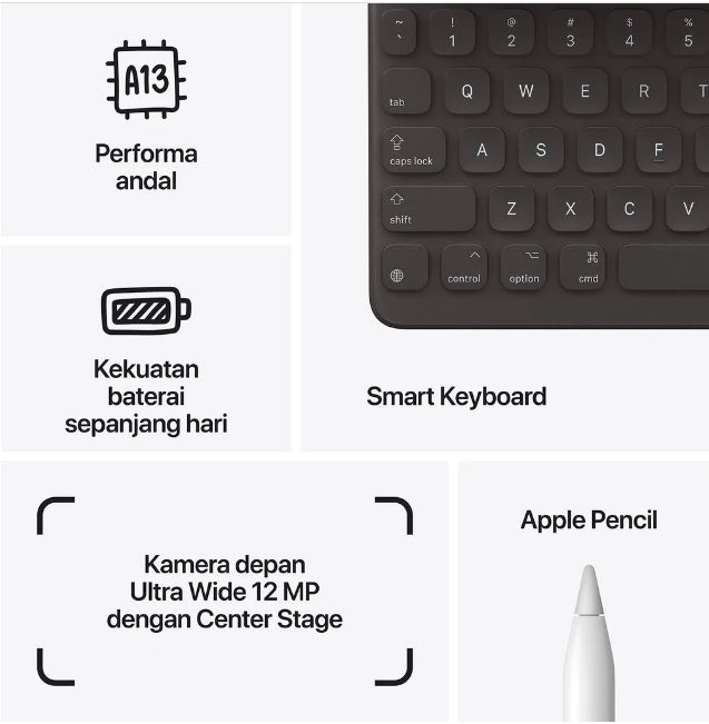 Begitu bertenaga. Mudah digunakan. Serbaguna. iPad baru memiliki layar Retina 10,2 inci yang indah, chip A13 Bionic andal, kamera depan Ultra Wide dengan Center Stage, dan berfungsi dengan Apple Pencil dan Smart Keyboard.(1) iPad memungkinkan Anda melakukan lebih banyak hal dengan mudah. Semuanya dengan harga luar biasa hemat. Poin-poin fitur utama Layar Retina 10,2 inci yang menawan dengan True Tone Chip A13 Bionic dengan Neural Engine Kamera belakang Wide 8 MP, kamera depan Ultra Wide 12 MP dengan Center Stage Penyimpanan hingga 64 GB Speaker stereo Touch ID untuk autentikasi aman Wi-Fi 802.11ac dan LTE (2) Kekuatan baterai hingga 10 jam (3) Konektor Lightning untuk pengisian daya dan aksesori Berfungsi dengan Apple Pencil (generasi ke-1) dan Smart Keyboard (1) iPadOS 15 sangat andal, mudah digunakan, dan dirancang untuk keserbagunaan iPad Legal Aplikasi tersedia di App Store. Ketersediaan judul dapat berubah sewaktu-waktu. (1) Aksesori dijual terpisah. Kompatibilitas bervariasi berdasarkan generasi. (2) Memerlukan paket data. Untuk lebih jelasnya, tanyakan kepada operator Anda. Kecepatan bervariasi menurut kondisi lokasi. (3) Kekuatan baterai bervariasi tergantung penggunaan dan konfigurasi.