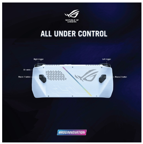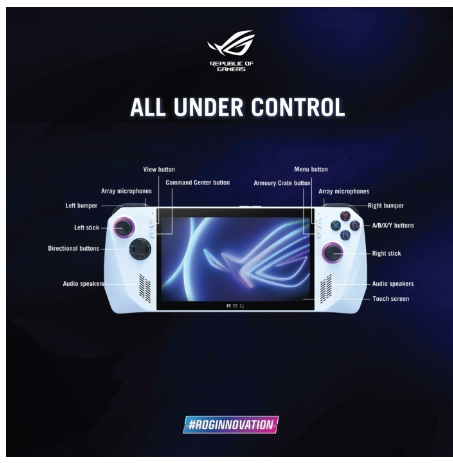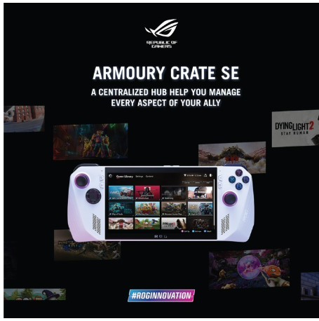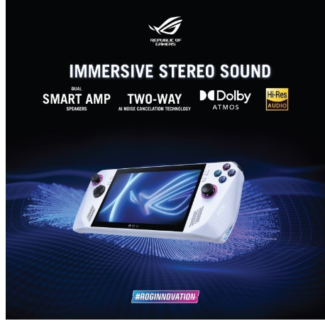 ASUS ROG Ally - RC71L-R1RADA2W Operating System Windows 11 Home Processor CPU: AMD Ryzen Z1 GPU: AMD Radeon™ Graphics (AMD RDNA™ 3, 12 CUs, up to 2.7 GHz, up to 8.6 Teraflops) TDP: 9-30W Display 7-inch FHD (1920 x 1080) 16:9 IPS-level glossy display sRGB: 100% Adobe: 75.35% Gorilla® Glass DXC Gorilla® Glass Victus™ Touch Screen (10-point multi-touch) Refresh Rate: 120Hz Response Time: 7ms Brightness: 500nits FreeSync Premium Memory 16GB LPDDR5 on board (6400MT/s dual channel) Storage 512GB PCIe® 4.0 NVMe™ M.2 SSD (2230) I/O Ports 1x 3.5mm Combo Audio Jack 1x ROG XG Mobile Interface and USB Type-C combo port (with USB 3.2 Gen2, support DisplayPort™ 1.4) 1x UHS-II microSD card reader (supports SD, SDXC and SDHC) Control and Input A B X Y buttons D-pad L & R Hall Effect analog triggers L & R bumpers View button Menu button Command Center button Armoury Crate button 2 x assignable grip buttons Thumbsticks: 2 x full-size analog sticks Haptics: HD haptics Gyro: 6-Axis IMU Audio AI noise-canceling technology Hi-Res certification Dolby Atmos Built-in array microphone 2-speaker system with Smart Amplifier Technology Network and Communication Wi-Fi 6E(802.11ax) (Triple band) 2*2 + Bluetooth® 5.2 (*Bluetooth® version may change with OS version different.) Battery 40WHrs, 4S1P, 4-cell Li-ion Power Supply TYPE-C, 65W AC Adapter, Output: 20V DC, 3.25A, 65W, Input: 100~240V AC 50/60Hz universal AURA SYNC Yes Weight 608 g Dimensions (W x D x H) 28.0 x 11.1 x 2.12 ~ 3.24 cm (11.02" x 4.37" x 0.83" ~ 1.28") Xbox Game Pass Xbox Game Pass for PC_3 months (*Terms and exclusions apply. Offer only available in eligible markets for Xbox Game Pass for PC. Eligible markets are determined at activation. Game catalog varies by region, device, and time.)