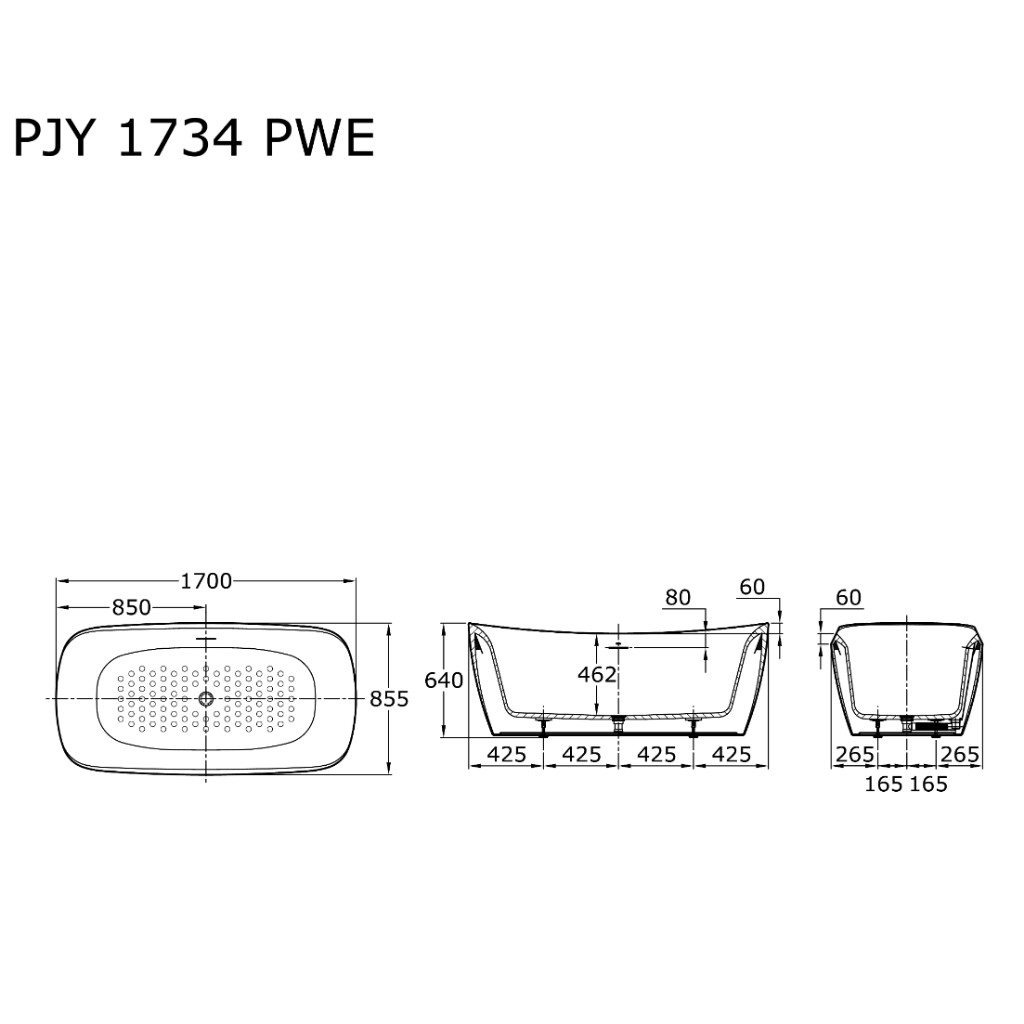 PJY1734PWE Cast Stone Bathtub With Pop-Up Waste Height 640 mm Width 1700 mm Depth 855 mm