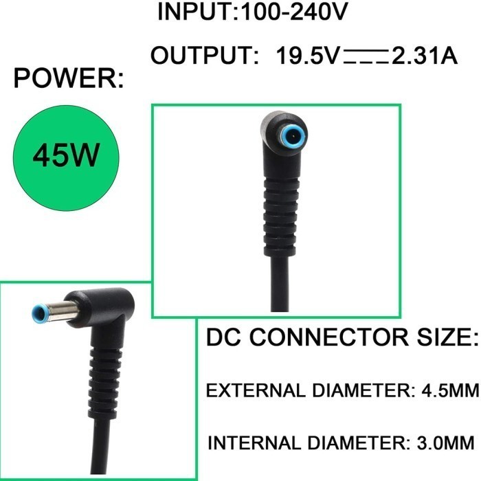 Input(AC) 100V-240V 50/60HzOutput (DC)19.5V 2.31APOWER 45W ( Max )Connector Size 4.5*3.0MMBERGARANSI 3 BULANBONUS kabel power listrik