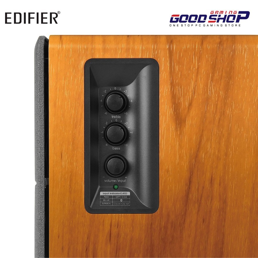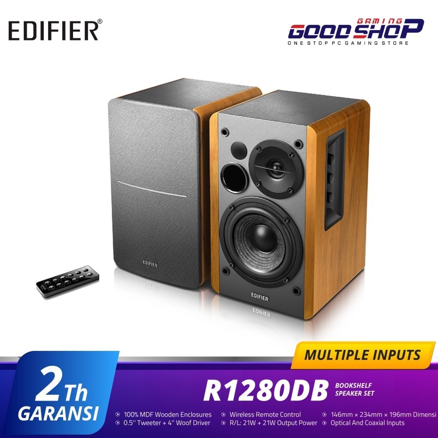 Spesifikasi Edifier Active 2.0 Bluetooth Bookshelf Speaker Set - R1280DB Total Power Output R/L: 21W+21W RMS Driver Bass unit: 4 inch (116mm) Tweeter unit: Diameter 13mm silk dome tweeter Frekuensi Respon 55Hz-20kHz Sound to Noise Ratio >=85dBA Koneksi Bluetooth version: V5.1 Port I/O LINE IN1 LINE IN2 OPT/COA Bluetooth Dimensi 152 x 241 x 177 mm