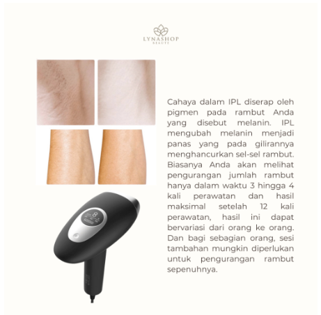 Cahaya dalam IPL diserap oleh pigmen pada rambut Anda yang disebut melanin. IPL mengubah melanin menjadi panas yang pada gilirannya menghancurkan sel-sel rambut. Biasanya Anda akan melihat pengurangan jumlah rambut hanya dalam waktu 3 hingga 4 kali perawatan dan hasil maksimal setelah 12 kali perawatan, hasil ini dapat bervariasi dari orang ke orang. Dan bagi sebagian orang, sesi tambahan mungkin diperlukan untuk pengurangan rambut sepenuhnya.