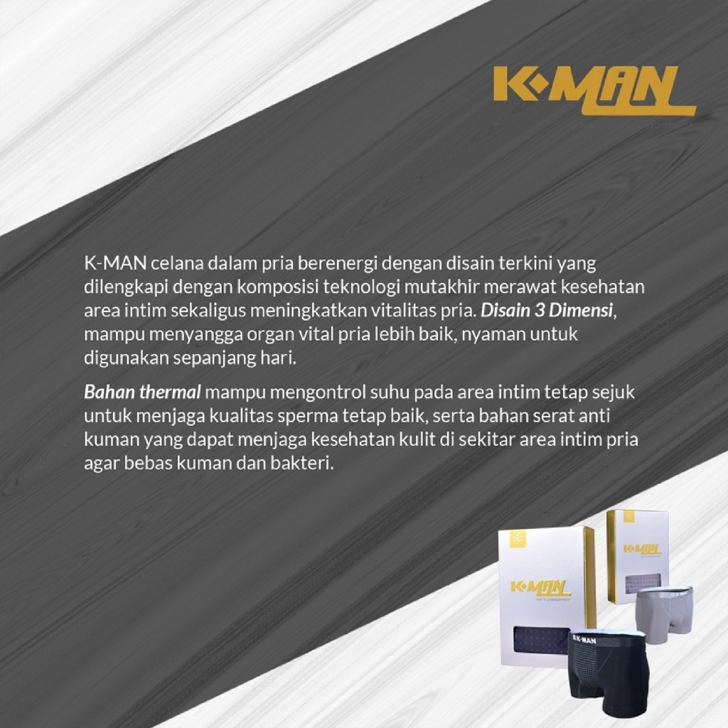K-Man K-Link Original / Celana Dalam Pria / CelanaTerapi Celana dalam yang bermanfaat untuk membantu menjaga kesehatan organ pria.Didukung teknologi terbaru untuk merawat kesehatan area int*m sekaligus meningkatkan vitalitas pria.Desain 3dimensi yang menyesuaikan bentuk dan anatomi tubuh mampu menyangga bagian organ dengan baik sehingga nyaman digunakan. KOMPOSISI: GERMANIUM •Menghasilkan Ion Negatif+Sinar Infra Merah •Melancarkan peredaran darah •Meningkatkan energi organ v*tal pria •Mengaktifkan sel-sel tubuh •Meningkatkan metabolisme •Membuang toksin dari dalam tubuh TITANIUM •Menghasilkan Ion Negatif+Sinar Infra Merah •Mencegah kerusakan sel akibat radiasi sinar matahari dan ion positif •Memberikan efek rileksasi pada tubuh •Menghilangkan ketegangan pada otot •Sebagai anti-bakteri TOURMALINE •Menghasilkan Ion Negatif+Sinar Infra Merah •Menghilangkan bau tak sedap akibat bakteri •Meredakan pegal-pegal di area pinggang •Mengatasi nyeri pada tulang pinggul dan tulang belakang •Menjaga kesehatan tubuh MAGNET  •Memancarkan Ion Negatif+Sinar Infra Merah •Melancarkan peredaran darah •Membunuh bakteri penyebab penyakit •Meningkatkan sistem imun tubuh BAHAN THERMAL •Mengontrol suhu pada area int*m tetap sejuk •Menjaga kualitas sp*rma tetap baik. SERAT ANTI KUMAN •Menjaga kesehatan kulit disekitar area int*m KAPAS ASLI •Lembut dan nyaman dipakai. KEUNGGULAN •Anti radiasi •Sp*rmatogenic(anti kem*ndulan) •Meningkatkan proses er*ksi pada pria •Meningkatkan masa ejak*lasi •Memberikan kepercayaan diri. PERAWATAN •Cuci dengan sabun mandi cair,hindari penggunaan detergent •Dikucek lembut,jangan menggunakan mesin cuci •Hindari penjemuran dibawah sinar matahari langsung,cukup angin-anginkan saja •Tidak perlu disetrika •Hindari penggunaan pemutih pakaian. VARIAN •Isi 2 Warna:Cokelat+Biru,Hitam+Abu •Isi 1 Warna:Coklat,Biru,Hitam,Abu UKURAN PINGGANG L:70–75cm XL:80–85cm XXL:85–90cm