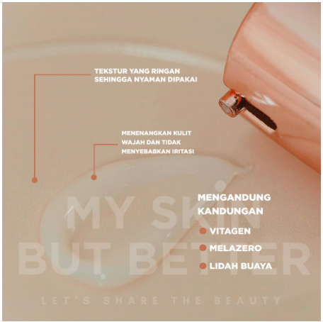 Hydrating Divine Essence adalah essence yang fungsi utamanya adalah mencerahkan, melembapkan, sekaligus melawan tanda penuaan. Bahan-bahan yang terkandung pada Hydrating Divine Essence merupakan bahan terbaik yang telah teruji secara klinis manfaatnya. Terdapat vitagen yang merupakan turunan dari vitamin C, dan melazero yang dapat mencerahkan wajah secara signifikan. Benefit : 1. Melembapkan kulit wajah secara intensif 2. Menenangkan dan mencegah terjadinya inflamasi dan iritasi 3. Memudarkan hiperpigmentasi seperti bekas jerawat, flek hitam dan bekas luka pada wajah 4. Mencerahkan kulit wajah secara signifikan Best For : 1. Kulit kering 2. Kulit dehidrasi 3. Kulit dengan bekas jerawat 4. Kulit hiperpigmentasi 5. Kulit yang mudah iritasi dan kemerahan How to Use: Gunakan Hydrating Divine Essence setelah menggunakan toner/Aloe Vera Soothing mist. Tuangkan 3-4 pump produk ke ujung jari, kemudian ratakan keseluruh wajah dengan merata, lalu tepuk-tepuk wajah hingga meresap. Gunakan pada pagi dan malam hari atau sebelum makeup. Ingredient : Water, Glycerin, Butylene Glycol, Triethanolamine, Arisaema Amurense Extract, Carbomer, Aminopropyl Ascorbyl Phosphate, Aloe Barbadensis Leaf Juice, Polyglutamic Acid, Phenoxyethanol, Decyl Glucoside, PEG-40 Hydrogenated Castor Oil, CI 77891, Fragrance, Tetracylgone 1 , 2-Hexandiol