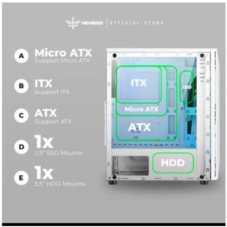 NYK Nemesis Casing Gaming T50 Imoogi 1. Thickness: 0.4mm SPCC 2. I/O Panel: USB 3.0*1 + USB 1.0*2 + HD Audio 3. Chassis Size: 320*180*410 mm 4. Case Size: 350*180*420 mm 5. Internal Drive: 3.5” HDD : 2; 2.5” SDD : 2 6. Fan Support: Front 2*12 cm; Rear 1*12 cm 7. Water Cooling Support: Front 240 mm; Rear 120 mm 8. CPU Height: 160 mm 9. VGA Length: 280 mm, 7 Slots 10. Motherboard Support: Micro ATX/ ITX / ATX 11. Left Side Panel: Glass 12. Right Side Panel: Metal 13. Front Panel: Black Plastic Panel + RGB LED Strip