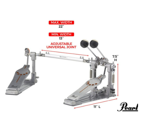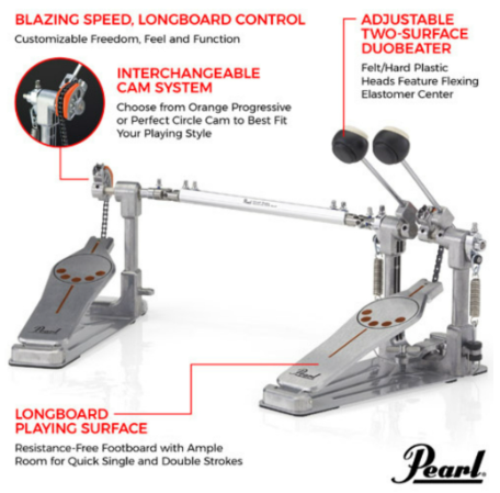 Demon-Style Longboard Double Bass Drum Pedal The P932 Chain Drive Double Bass Drum Pedal features Demon-style Longboard Pedal Plates, two-position Powershifter function, Interchangeable Cam, and Click Lock spring tension adjustment for exceptional double bass drum play on a single bass drum. Its Demon-style Longboard Pedal Plate allows for quick rebound and fast heel-down/heel-up playing transition. Two-position Powershifter function completely changes pedal feel and power, and Pearl's Patented Interchangeable Orange Progressive Cam can be removed for play with the Perfect Circle cam, changing speed and acceleration throughout the stroke. Built to deliver speed, power, and exceptional performance at an unbeatable value. DRIVE: Single Chain DRIVE CAM: Perfect Circle Cam w/ Removable Orange Eccentric Cam BEATER: Control Core DuoBeater BEATER ANGLE: Infinitely Adjustable Beater Angle UNIVERSAL JOINT: Length and Position Adjustable