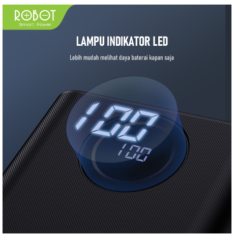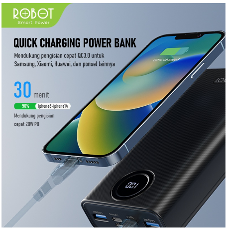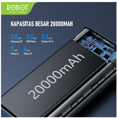 Spesifikasi: Brand : ROBOT item Code : RT23 Capacity: 20000mAH Power : 74Wh Lighting input: DC 5V/2A, 9V/2A Micro input: DC 5V/2A, 9V/2A, 12V/1.5A Type-C input: DC 5V/2A, 9V/2A, 12V/1.5A Type-C out : DC 5V/3A, 9V/2.22A, 12V/1.67A OUT1/OUT2 Output : DC5V3A, 9V/2A, 12V/1.5A 4.5V/5A,5V/4.5A(22.5W)OUT1+OUT2+Type-C Output : DC 5V/3A MAX Keunggulan: 1. Quick charging power bank. Mendukung pengisian cepat QC3.0 untuk Samsung, Xiaomi, Huawei, dan ponsel lainnya. 2. Mendukung pengisian cepat 20W PD. Mengisi daya Iphone8-Iphone14 50% selama 30 menit. 3. 3 port input dan output. 4. Port input Mikro, Type-C dan lighting. 5. Port USB-A ganda, dan Type-C, untuk mengisi 3 daya perangkat secara bersamaan. 6. Dengan PD charger, mengisi daya penuh dalam 7 jam. 7. Lampu indikator LED, lebih mudah melihat daya baterai kapan saja. 8. Kapasitas besar 20000 mAh. In The Box: 1 x Robot RT23 20000mAh 1 x Cable Micro 1 x Kartu Garansi