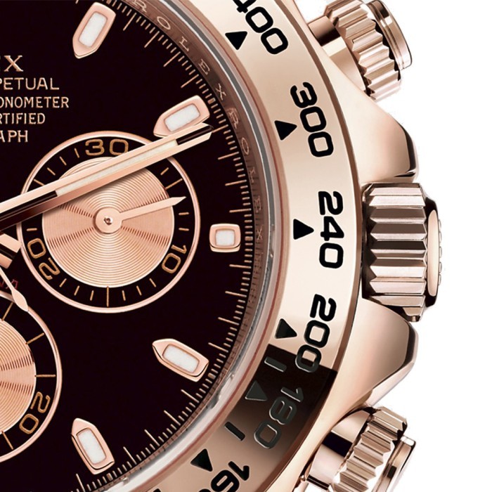 This model features a bright black and Sundust dial with snailed counters, 18 ct gold applique hour markers and hands with a Chromalight display, a highly-legible luminescent material. To preserve the beauty of its pink gold watches, Rolex created and patented an exclusive 18 ct pink gold alloy cast in its own foundry: Everose gold.