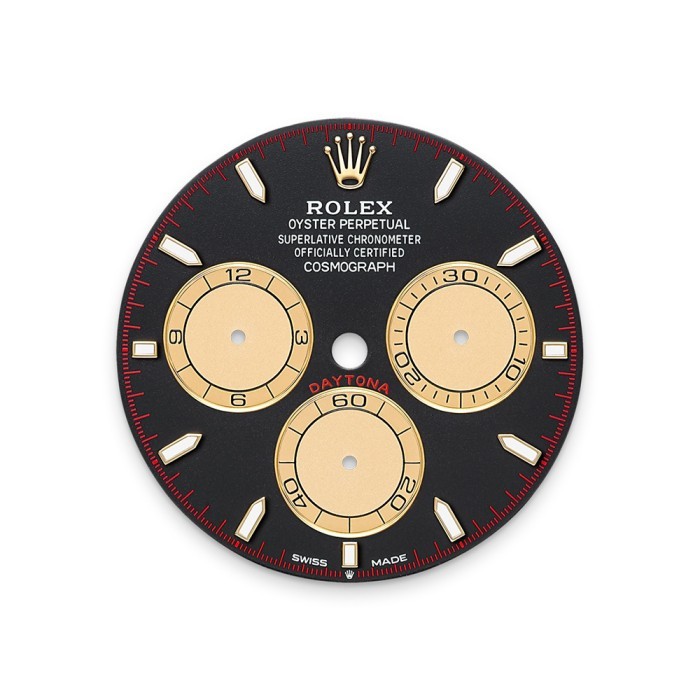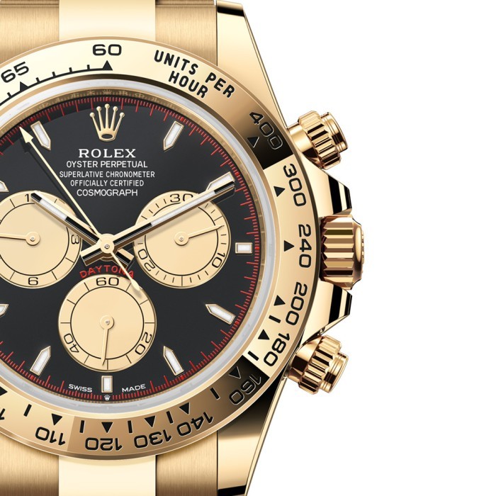 With its tachymetric scale, its three counters and its pushers, the Cosmograph Daytona was designed to be the ultimate timing tool for endurance racing drivers. The bezel features a tachymetric scale to read average speed over a given distance based on elapsed time. This model features an intense black and champagne-colour dial with snailed counters, 18 ct gold applique hour markers and hands with a Chromalight display, a highly-legible luminescent material.