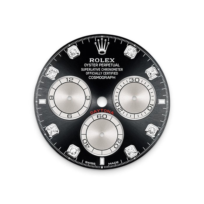 This model features a bright black and steel, diamond-set dial with snailed counters, 18 ct gold applique hour markers and hands with a Chromalight display, a highly-legible luminescent material. With its tachymetric scale, its three counters and its pushers, the Cosmograph Daytona was designed to be the ultimate timing tool for endurance racing drivers. The bezel features a tachymetric scale to read average speed over a given distance based on elapsed time.