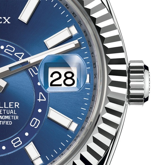 A fixed inverted red triangle on the dial points to the chosen reference time – the time at home or at the traveller’s usual workplace – on the off-centre 24-hour disc. At a glance, this 24-hour display clearly distinguishes daytime hours from night-time hours in the other time zone. The Rolex fluted bezel is a mark of distinction. Originally, the fluting of the Oyster bezel had a functional purpose: it served to screw the bezel onto the case, helping to ensure the waterproofness of the watch.
