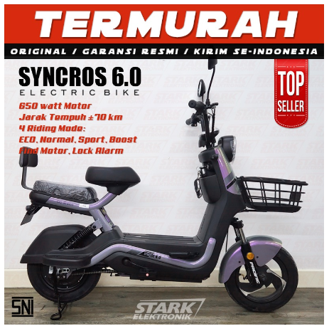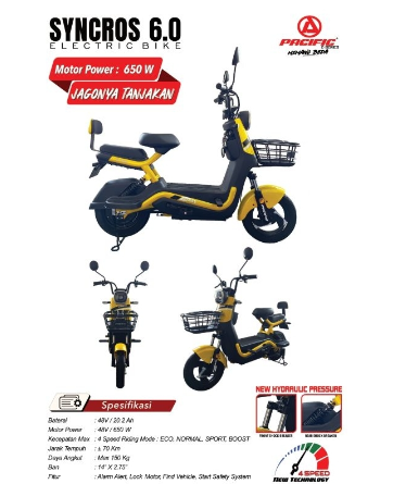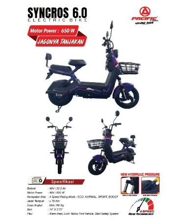 SEPEDA LISTRIK / E-BIKE MEREK : PACIFIC TYPE : SYNCROS 6.0 JAGO NYA TANJAKAN BATERAI 48V / 20.2 AH MOTOR POWER 48V / 650 W KECEPATAN MAX 4 SPEED ( ECO,NORMAL,SPORT,BOOST ) JARAK TEMPUH -+ 70KM DAYA ANGKUT MAX 150KG BAN UKURAN 14x2.75" FITUR ALARM ALERT, LOCK MOTOR, FIND VEHICLE, START SAFETY SYSTEM [ GARANSI ] - Garansi Frame 5 Tahun - Garansi Dinamo 1 Tahun - Garansi Baterai 6 Bulan - Dll Terdapat Di Manual Book [ ISI PAKET ] - 1 Unit Sepeda Listrik - 1 Unit Adaptor - 1 Set Kelengkapan - 1 Buku Manual