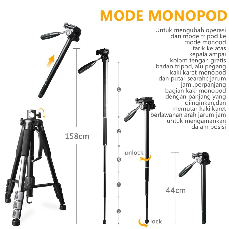 - Tripod terbuat dari bahan aluminium tahan lama.